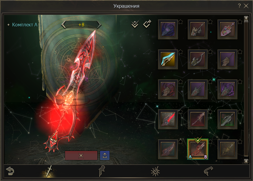 Доступен единый интерфейс для: внешний вид оружия, внешний вид брони, эффект убийства и фон для имени. ![]() Внимание. На данный момент не доступна система раздельных внешних видов для Комплекта А и Комплекта В, поэтому все операции по ивзлечению и применению обликов необходимо проводить на обоих комплектах. |